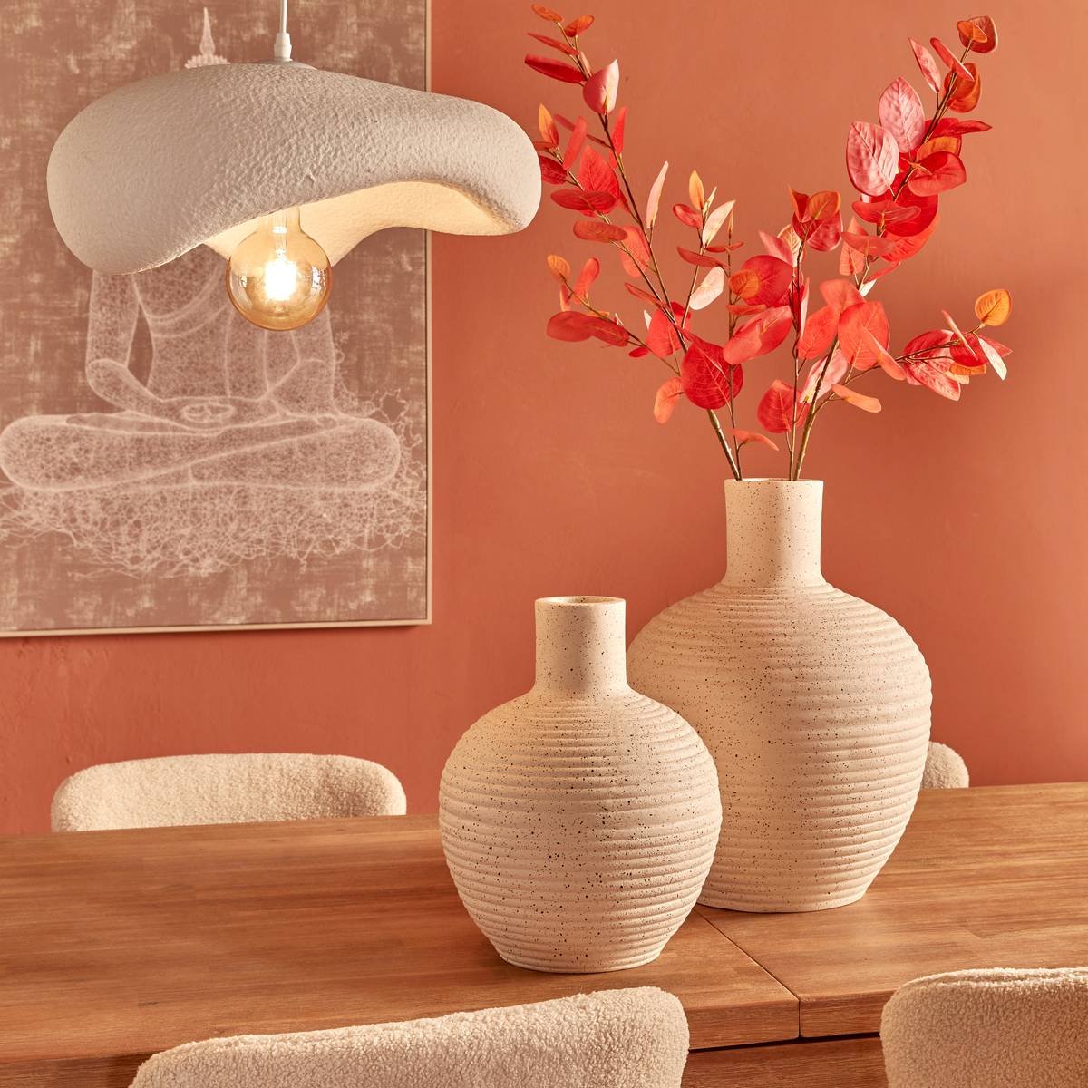 La suspension Teiva se distingue par un abat-jour remarquable sous la forme d’une fleur unique. Elle semble avoir été réalisée à la main pour un effet très naturel. Sobre et épurée, la suspension Teiva est faite d’une couleur neutre afin de se fondre parfaitement dans n’importe quel décor intérieur. Installez votre luminaire au-dessus d’une table en bois Atmosphera et profitez d’une salle à manger très chaleureuse.